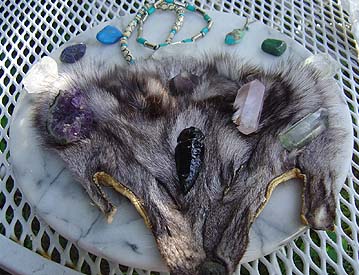 Here are some pictures of my black obsidion wand, deer handle with a turtle shell-rattle and the two fur skins of head of a gray/black fox, and brown coyote